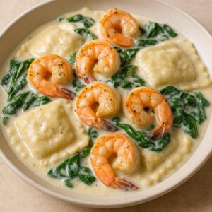 Savory Meets Creamy: Shrimp & Spinach Ravioli in a Luscious Garlic Cream Sauce